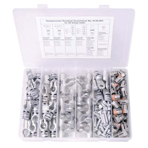 2/0 GA Compression Connector Kit designed to make permanent repairs in the field without special tools. Contains 120 Pieces in a heavy duty plastic box- durable and weather resistant.