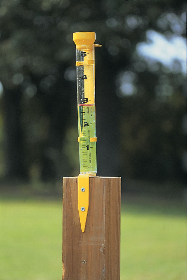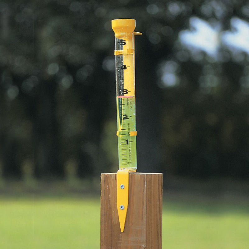 For lawn, garden, nursery, or general use. Capacity: 5” with 0.1” graduations. Magnifier funnel makes accumulation easy to read from a distance! Mounted on a 16” sharpened steel frame. Push it into your lawn, garden, or field as a rain or sprinkler gauge. Also mounts on a post.
