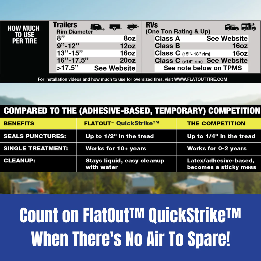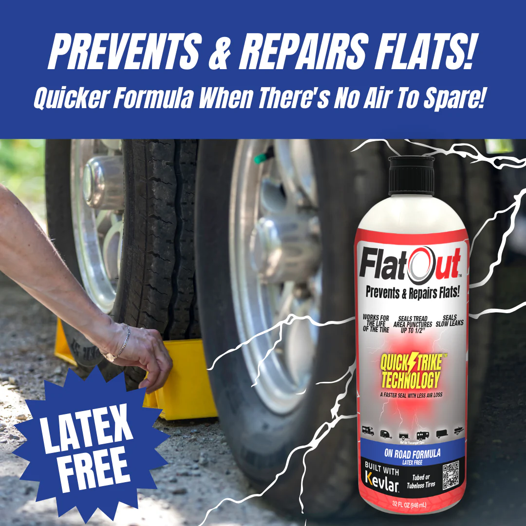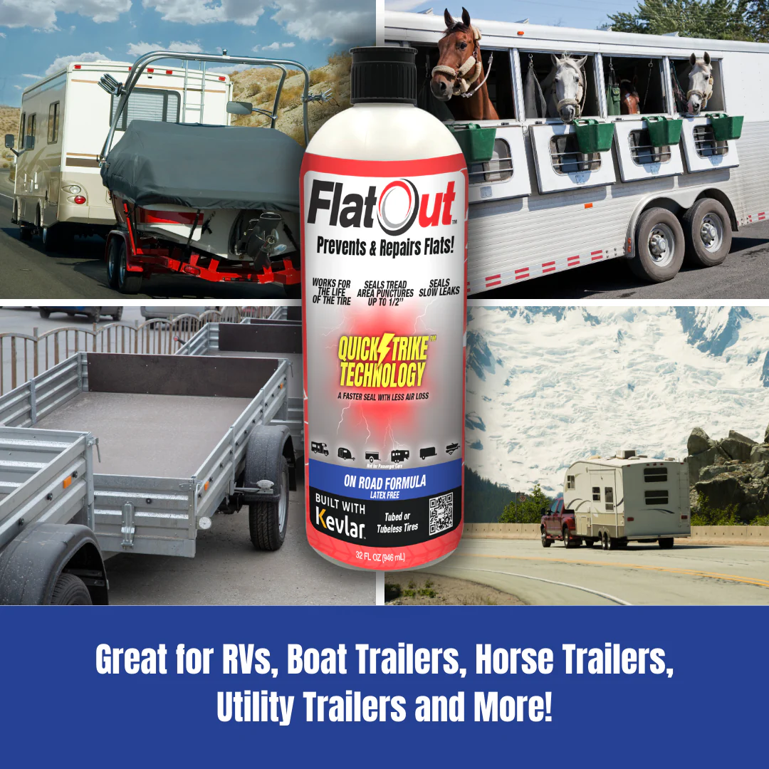 - INTENDED FOR: FlatOut QuickStrike On Road Formula is perfect for RVs, Boat Trailers, Horse Trailers, Utility Trailers and More. (Not recommended for passenger vehicles)