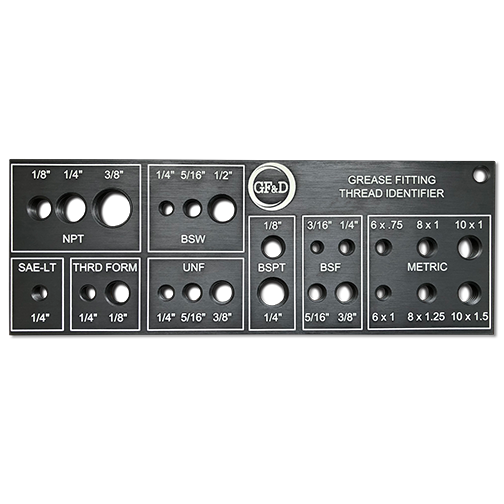 The Grease Fitting Thread Identifier will quickly and easily identify thread patterns for the 24 most common Standard, British and Metric Grease Fittings (Zerks). With the extensive amount of thread types and sizes one can encounter when working with these fittings, this tool will take the guesswork out of the job and ensure a proper fit the first time.