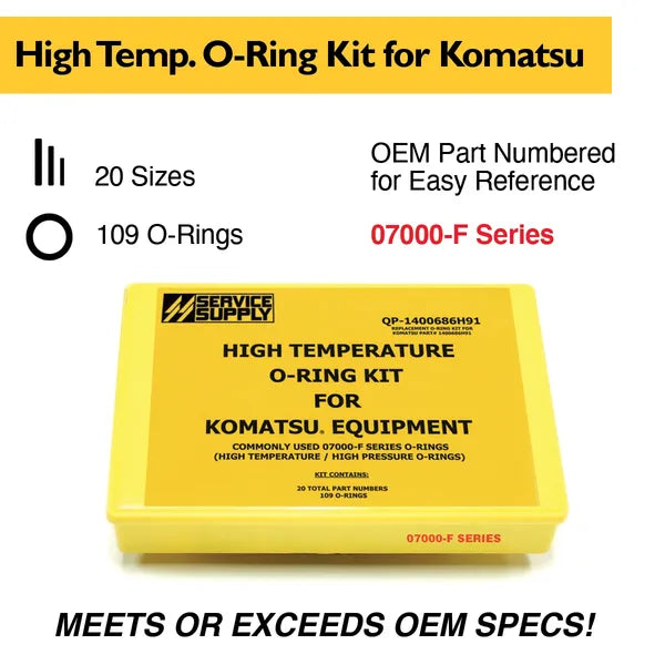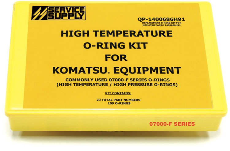 This single-sided o-ring service kit contains commonly used 07000 high temp and pressure F series o-rings for Komatsu equipment, and replaces Komatsu kit #1400686H91.