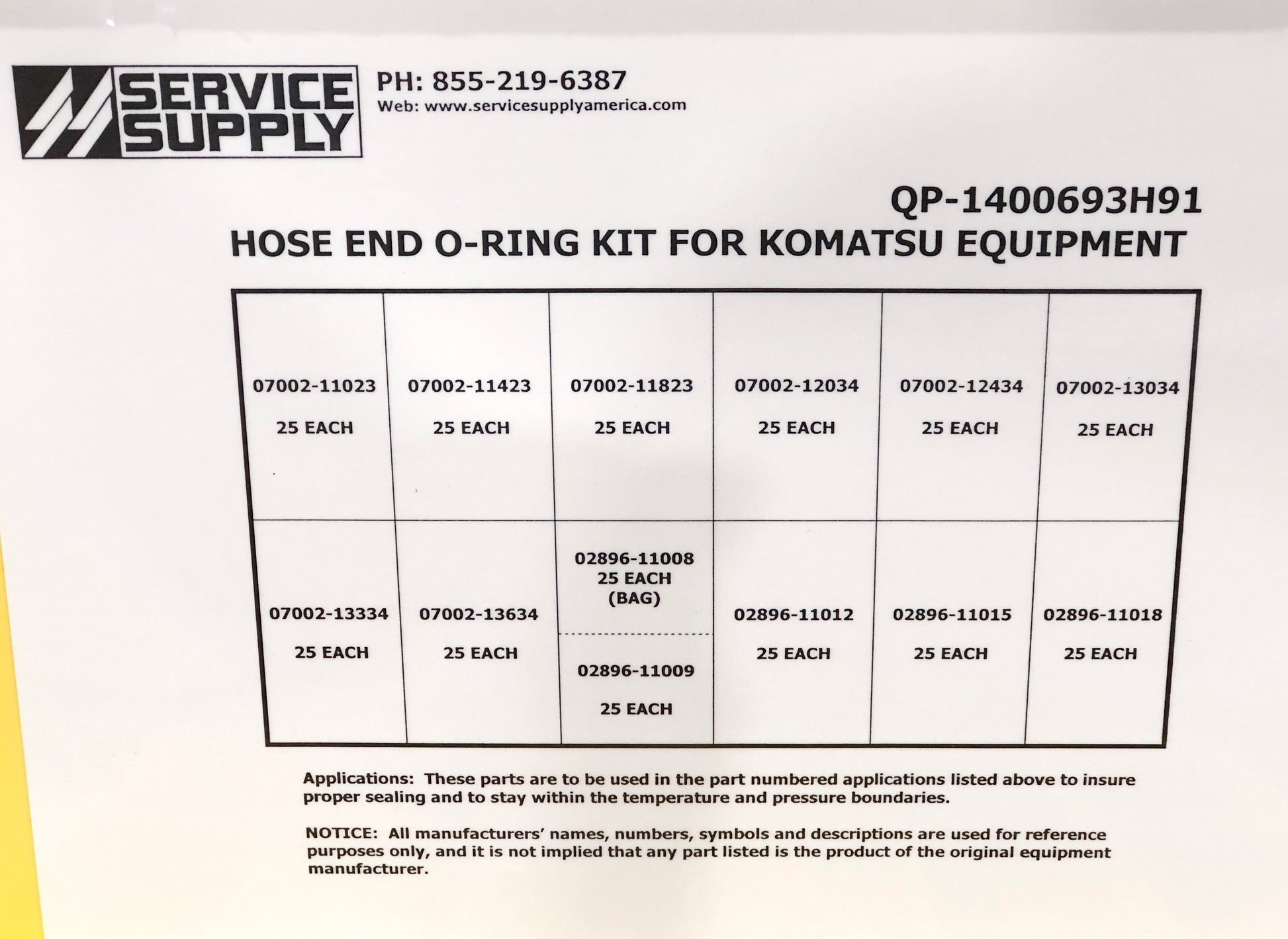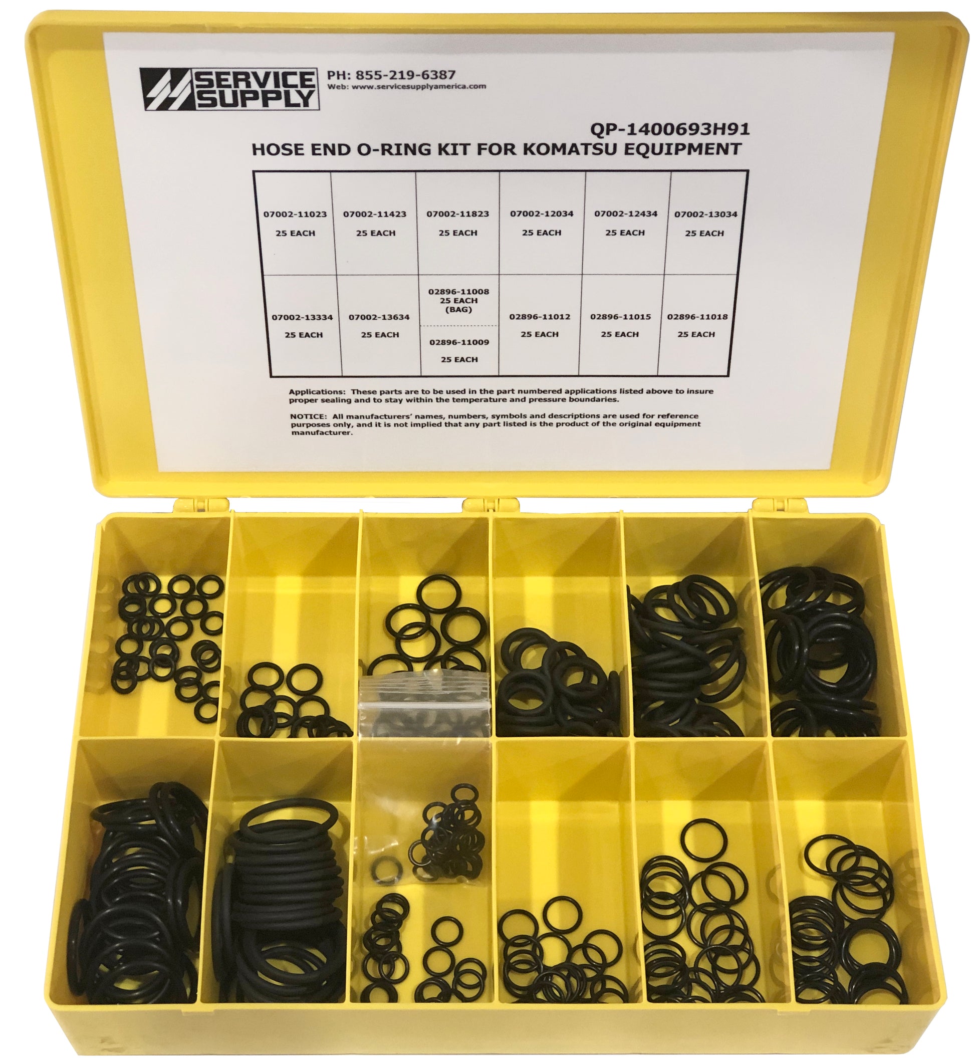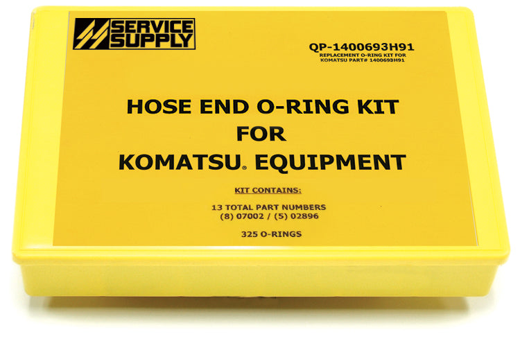 This single-sided o-ring service kit contains commonly used 07002 /02896 face seal / embedded hose joint o-rings for Komatsu equipment, and replaces Komatsu kit #1400693H91.