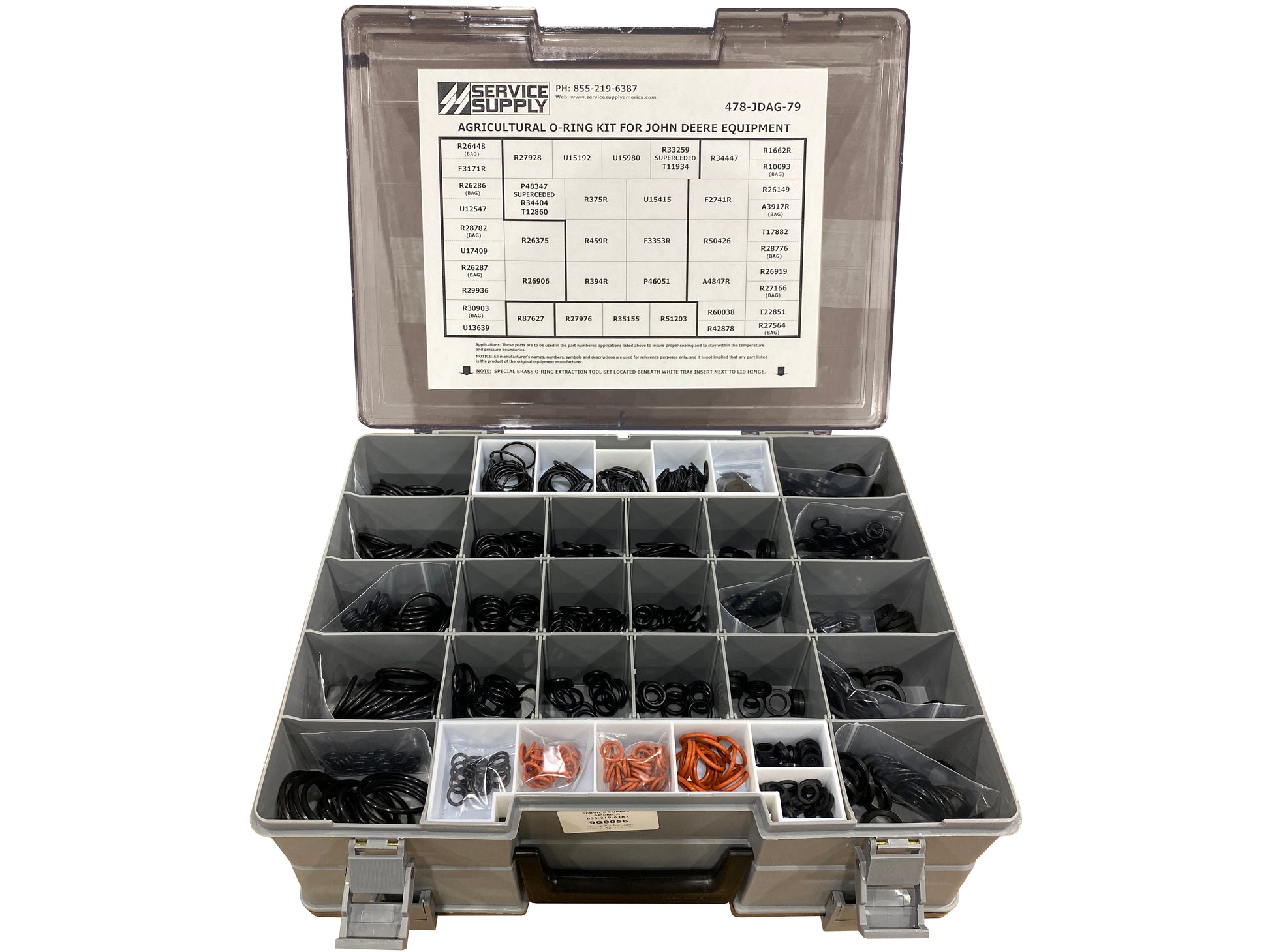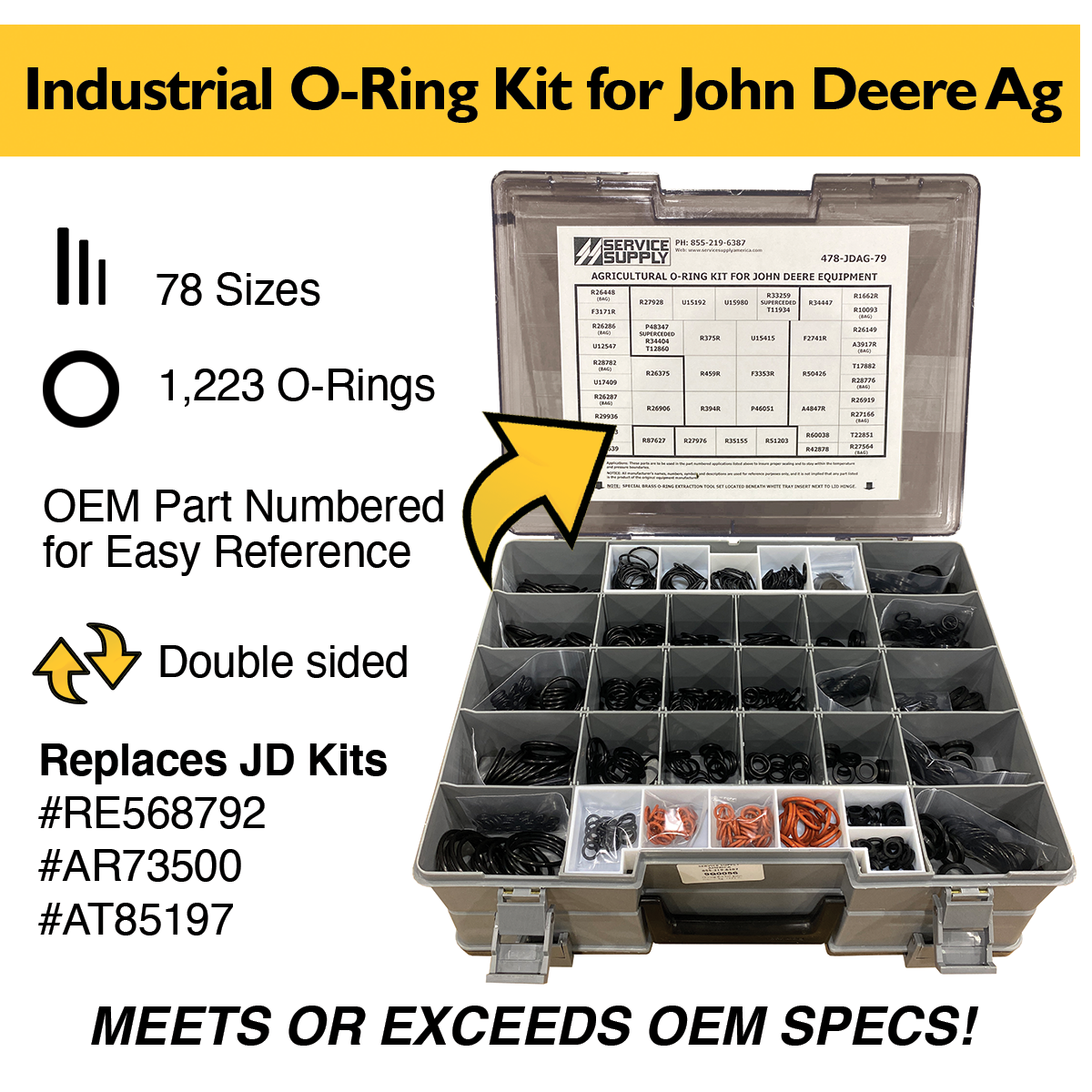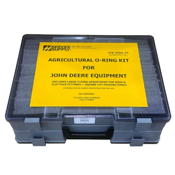 This double-sided, Industrial-grade AGRICULTURE O-ring kit contains a large assortment of high and low-pressure O-rings for John Deere agricultural equipment, which replaces John Deere kits # RE568792, #AR73500, and also includes John Deere kit # AT85197.