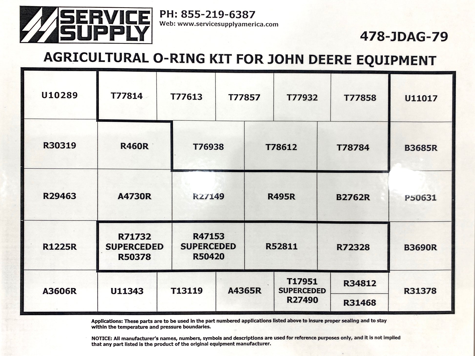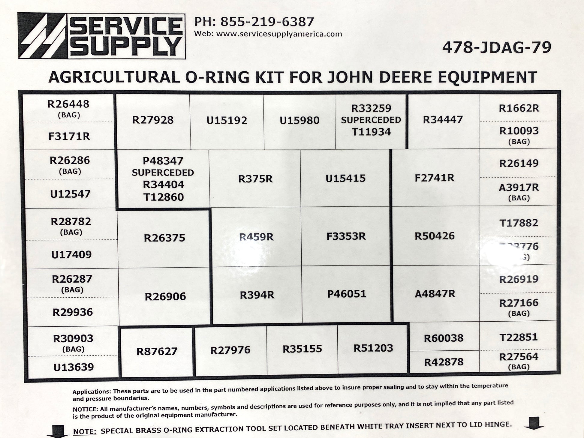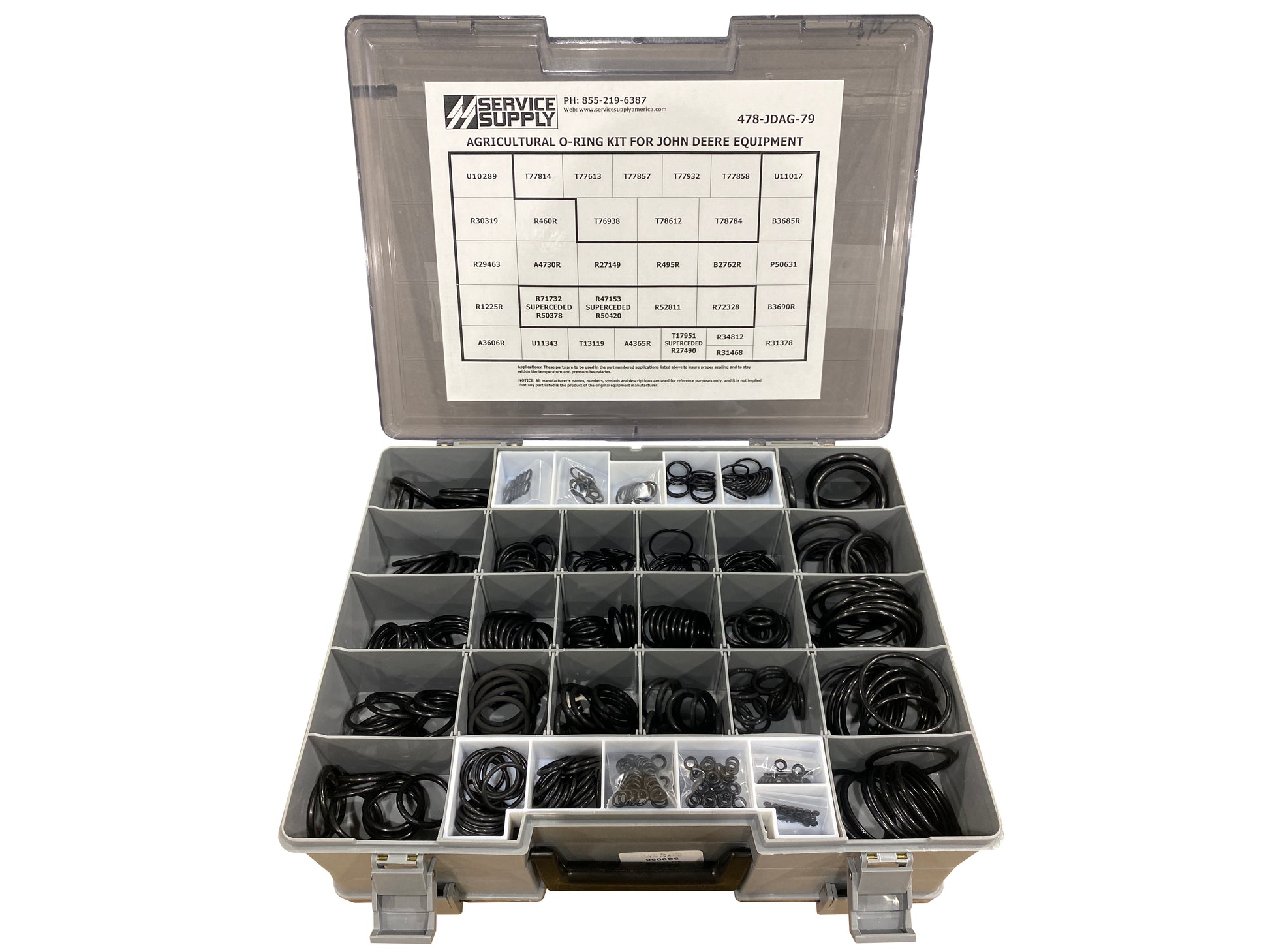 This double-sided, Industrial-grade AGRICULTURE O-ring kit contains a large assortment of high and low-pressure O-rings for John Deere agricultural equipment, which replaces John Deere kits # RE568792, #AR73500, and also includes John Deere kit # AT85197.