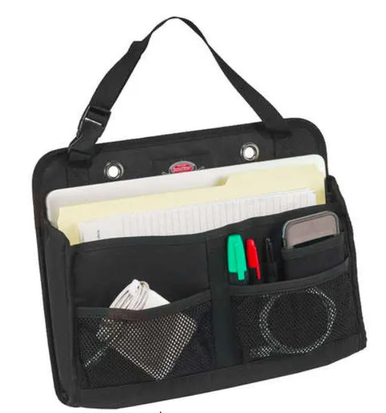Take your office with you! This organizer features an adjustable retaining strap that attaches to the front or back of your vehicle’s seat. The back compartment holds up to a 15” laptop. Other storage includes two front mesh pockets to hold note pads and pens; a middle file folder for documents; three pen holders; and a cell phone pocket. Dimensions: 12” x 15.1” x 3”.