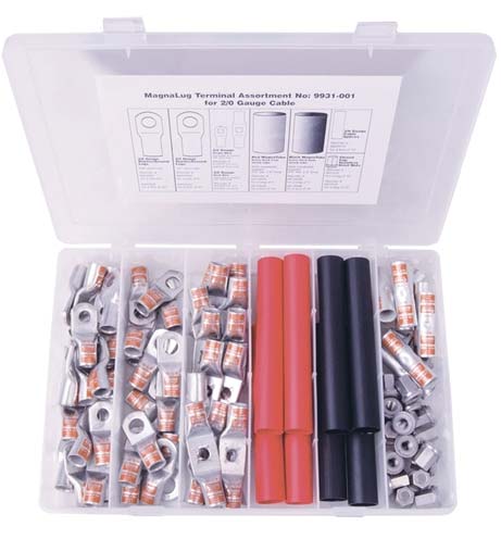 87 Piece kit features a variety of lugs, heat shrink, and butt splices in a heavy duty plastic box- durable and weather resistant. Fits 2/0 Gauge.