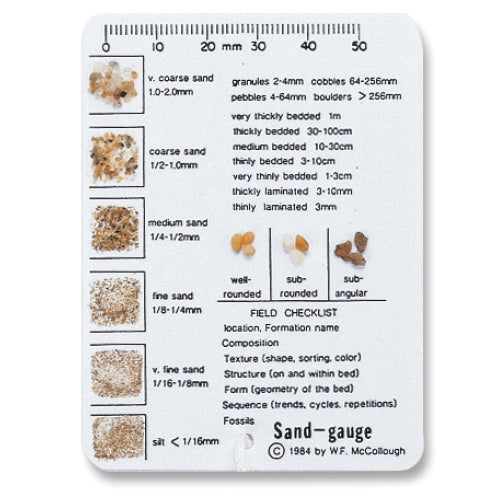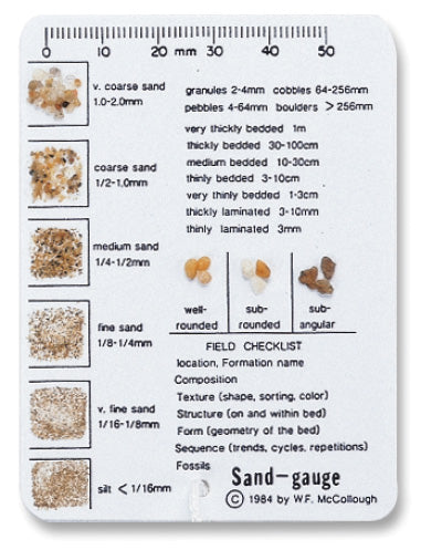 Flexible, waterproof plastic card has sand grains ranging from very coarse sand to fine silt permanently fused on plastic card. Additional features include size classification for large clasts, bed thickness classification, roundness chart with actual sand grains, field checklist for organizing notes, geologic time scale, and two carbonate classification charts.
