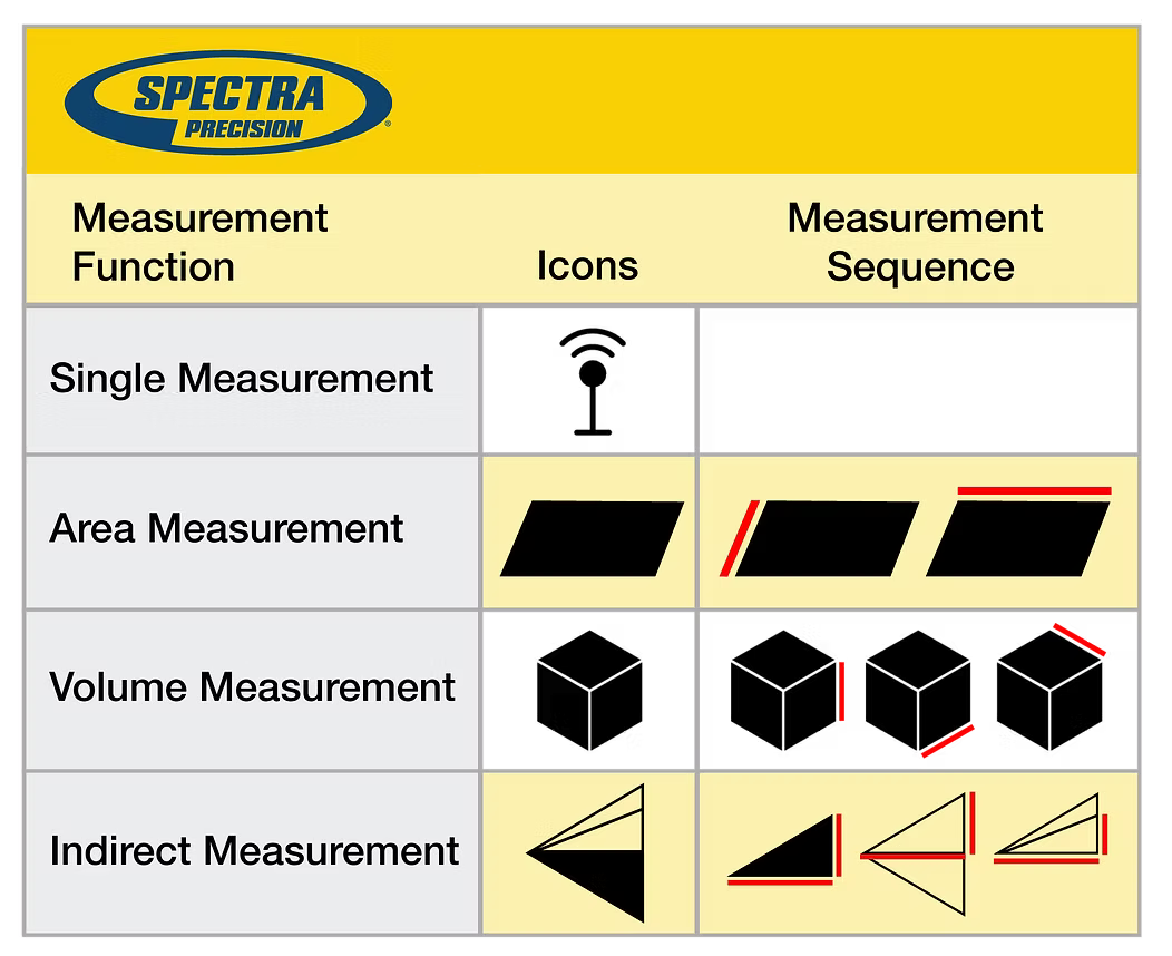 - Functions: Single Measure, Continuous measure, Area, Volume, Addition, Subtraction, Indirect Measure ((Pythagorean Mode), Tilt Sensor