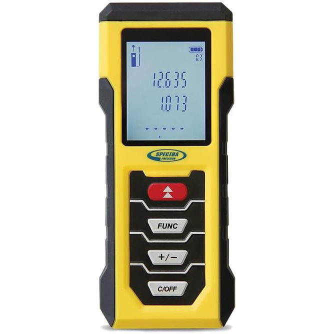 The Spectra Precision® QM20 Laser Distance Meter is compact, fitting comfortably in your hands and in your pocket or tool belt. Simply press a button to take a measurement – simple to operate and easy to use. Functions include indirect measurements using the Pythagorean mode. A tilt sensor is visible on the LCD. Area and volume calculations are also possible.