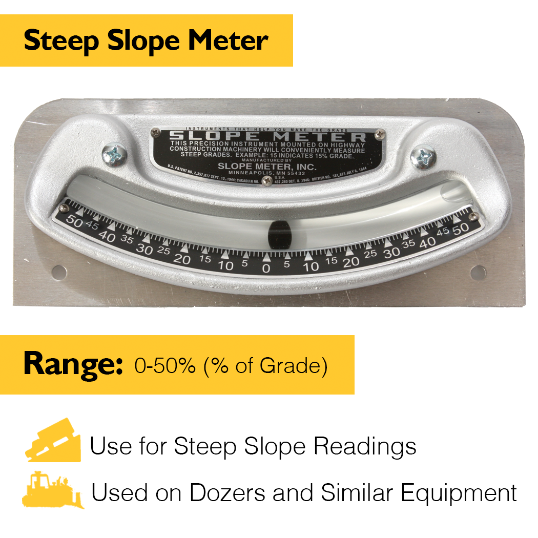 Calibrated in percentage of grade from 0 to 50%. A major use for this meter is in all areas where a steeper slope reading is needed. This product works well on bulldozers and similar equipment. Range: 0-50% (% of grade)