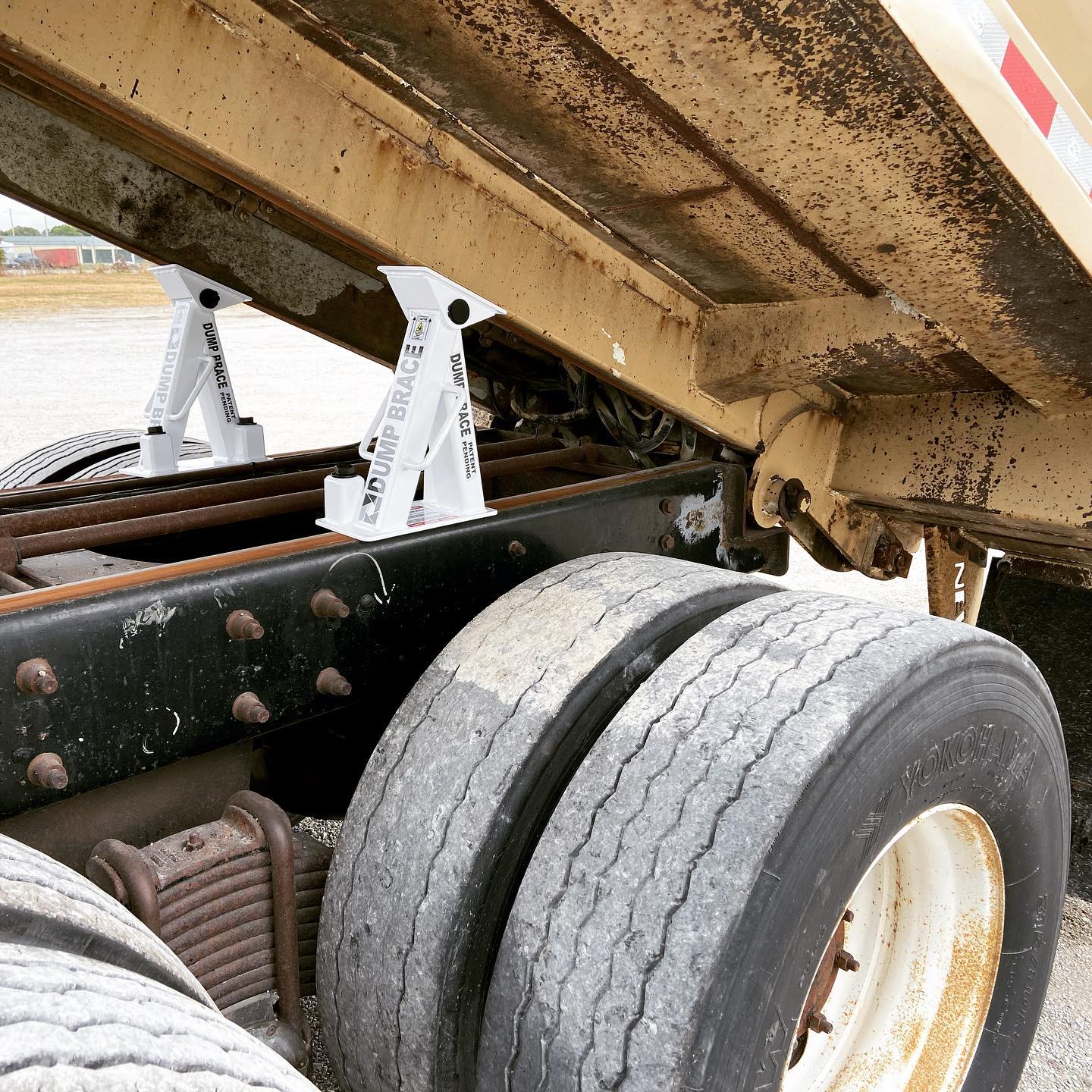 - STEP ONE: Set DUMP BRACE® safety locks onto the truck frame with a clamping mechanism beneath the flange.
