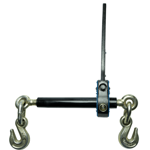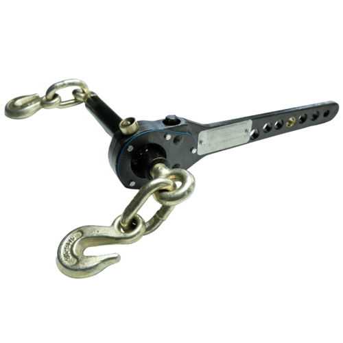 Zinc coated rings, hooks and post threads. We are 25 to 1 gear reduced on this model. Long handle off set to bring the gear set closer to the operator for easier operation. The handle is a reaction bar. Needs to be in contact with the floor or equipment for proper tension retention. This latest version is our highest quality yet. Truly the best binder on the market bar none. Gets chains tighter, safely and faster than anything on the market. Store your endlinks inside the barrel when storing and they will be out of the road salt/brine and stay lubricated. Heavy/implement grade paint resistant to chipping, zinc coated, sealed gear box. You will love these!
