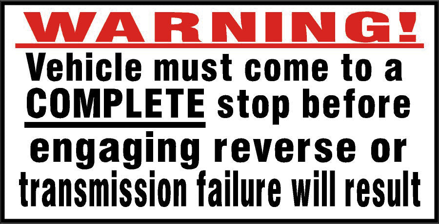 "WARNING! Vehicle must come to a COMPLETE stop before engaging reverse or transmission failure will result"